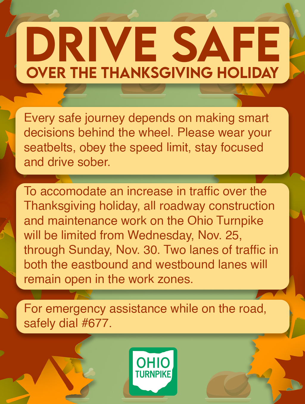 Ohio Turnpike, Ohio State Highway Patrol Urge Motorists to Practice Safe Driving over the Thanksgiving Holiday